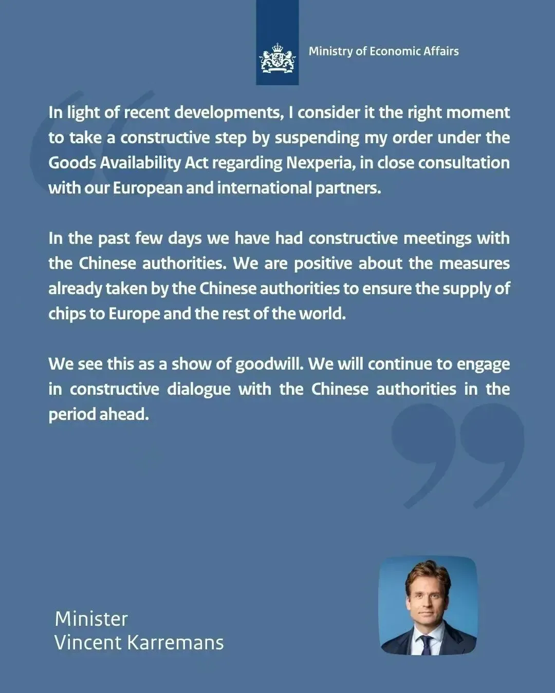 这场重要磋商最终于18日和19日在北京进行。随后,荷兰经济事务部官网发布公告,部长卡瑞曼斯(Vincent Karremans)宣布,暂停此前针对安世半导体的相关干预措施。据环球网报道,其在社交媒体X上发声明表示。“鉴于近期的事态发展,我认为现在是采取建设性步骤的正确时机。”