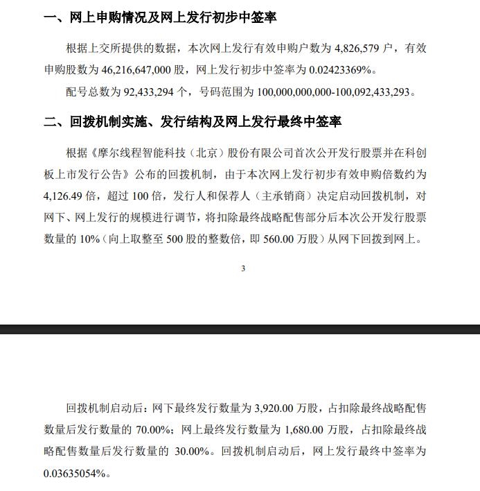 由于本次网上发行初步有效申购倍数约为4126.49倍,超过100倍,发行人和保荐人(主承销商)决定启动回拨机制,对网下、网上发行的规模进行调节。