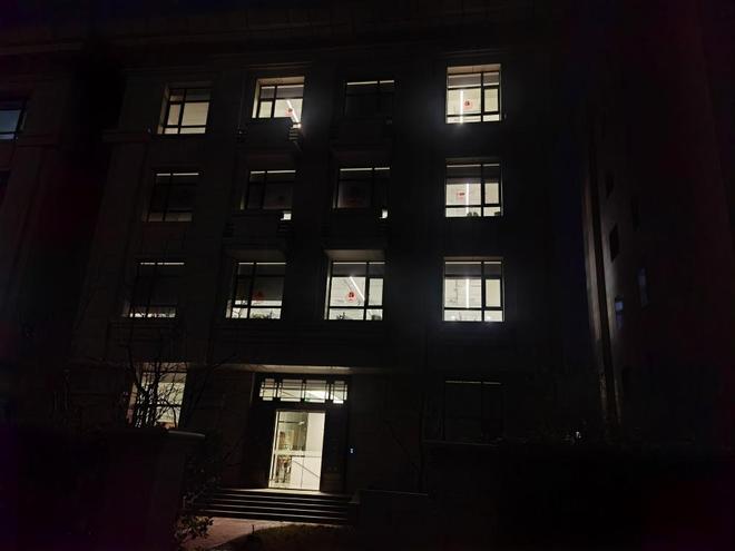 向楼内张望,此时楼内的灯还亮着,仅可以看到靠窗的工位有一个人员在楼内,看不到其他人。