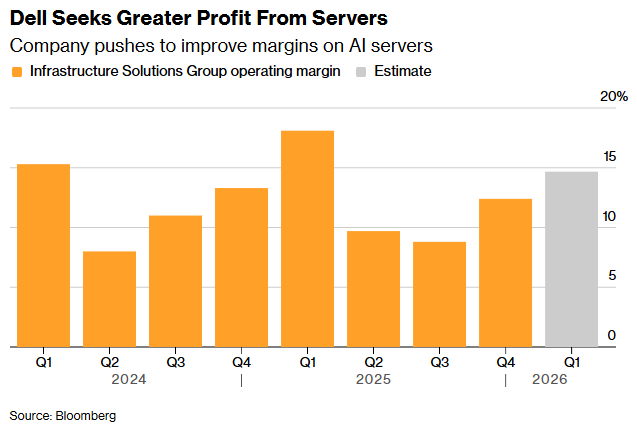 但赢得并满足这些订单也使戴尔科技承受更高成本,该公司正努力提升其AI服务器业务的利润率。戴尔科技包含服务器和网络销售的基础设施解决方案部门第三季度的营业利润率为12.4%,好于分析师普遍预期的11.2%。
