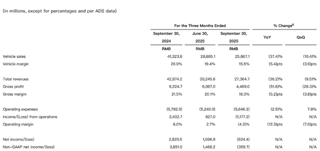 因10月底主动召回部分理想MEGA并计入相关成本,理想汽车三季度毛利率走低且当季亏损。11月26日,理想汽车披露,公司在2025年第三季度实现营收273.65亿元,同比下滑36.2%,略高于市场预估的266亿元;第三季度净亏损6.24亿元,去年同期则为实现净利润28.21亿元;经调整(Non-GAAP)净亏损为3.6亿元,去年同期净利润为38.51亿元;截至第三季度末,理想汽车现金储备高达989亿元。