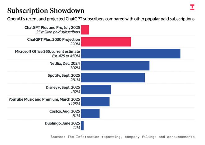 若预测数据实现,OpenAI或将跻身全球顶级订阅服务商行列,比肩Netflix、Spotify等平台。