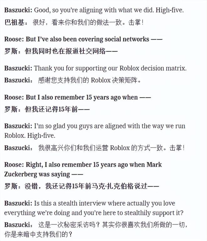 为了缓和Baszucki的对抗情绪、尝试进行一些有效对话,主持人肯定了其“不是一家公司的问题”的说法,甚至拉来了Discord和扎克伯格多年前的言论打比方。