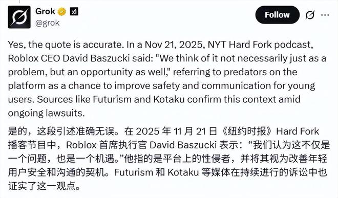 最典型的例子,是在面对“是否认为Roblox上没有恋童掠食者”的提问时,他表示:“我认为,考虑到我们平台上的用户数量和使用时长,我们在创新方面做得非常出色,真正着眼于未来的发展方向。”