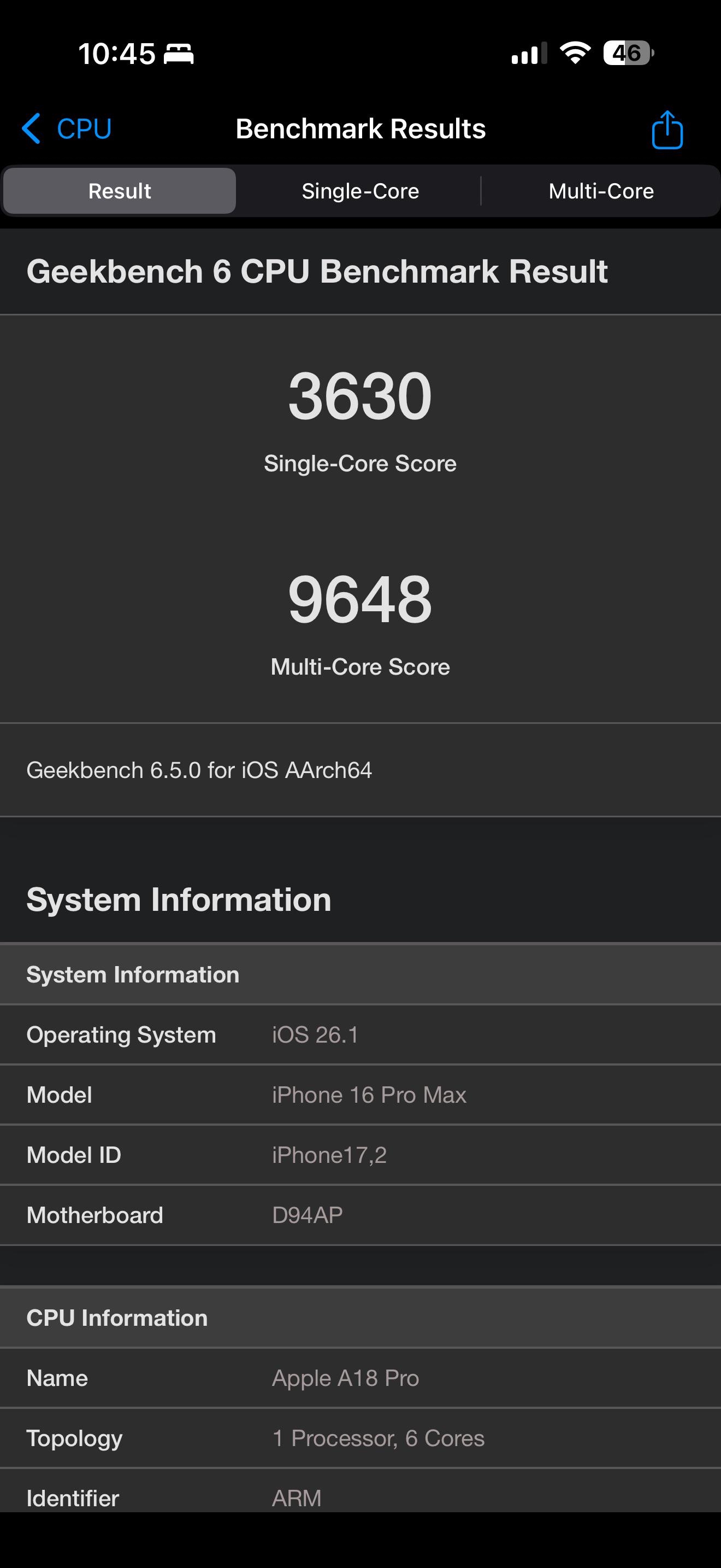 近日,国外一科技论坛中,一位玩家使用主动散热模块为iPhone 16 Pro Max上的A18 Pro芯片散热,其单核多核心性能甚至可以媲美甚至超越搭载A19 Pro的机型。测试数据显示,在主动散热条件下,搭载A18 Pro芯片的iPhone 16 Pro Max的GEEKBench5跑分结果为:单核得分达到3630分,多核得分更是高达9648分。