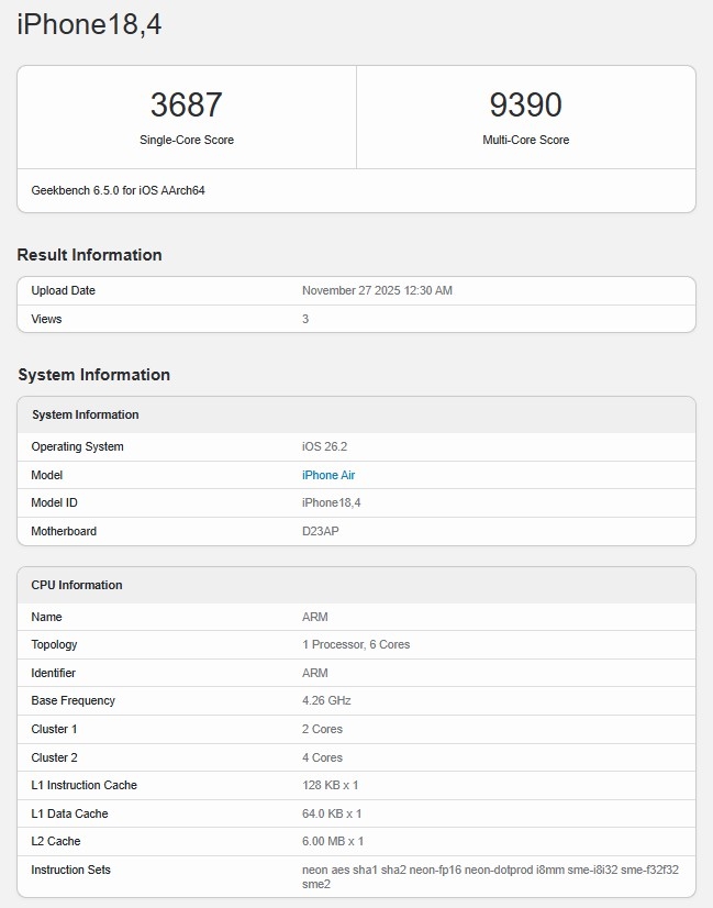 而搭载A19 Pro芯片的iPhone Air,通过内置散热,跑分结果为:单核得分达到3687,多核得分为9390分,单核 A19 Pro 仅领先 57 分,多核反而被上代 A18 Pro 反超 258 分。