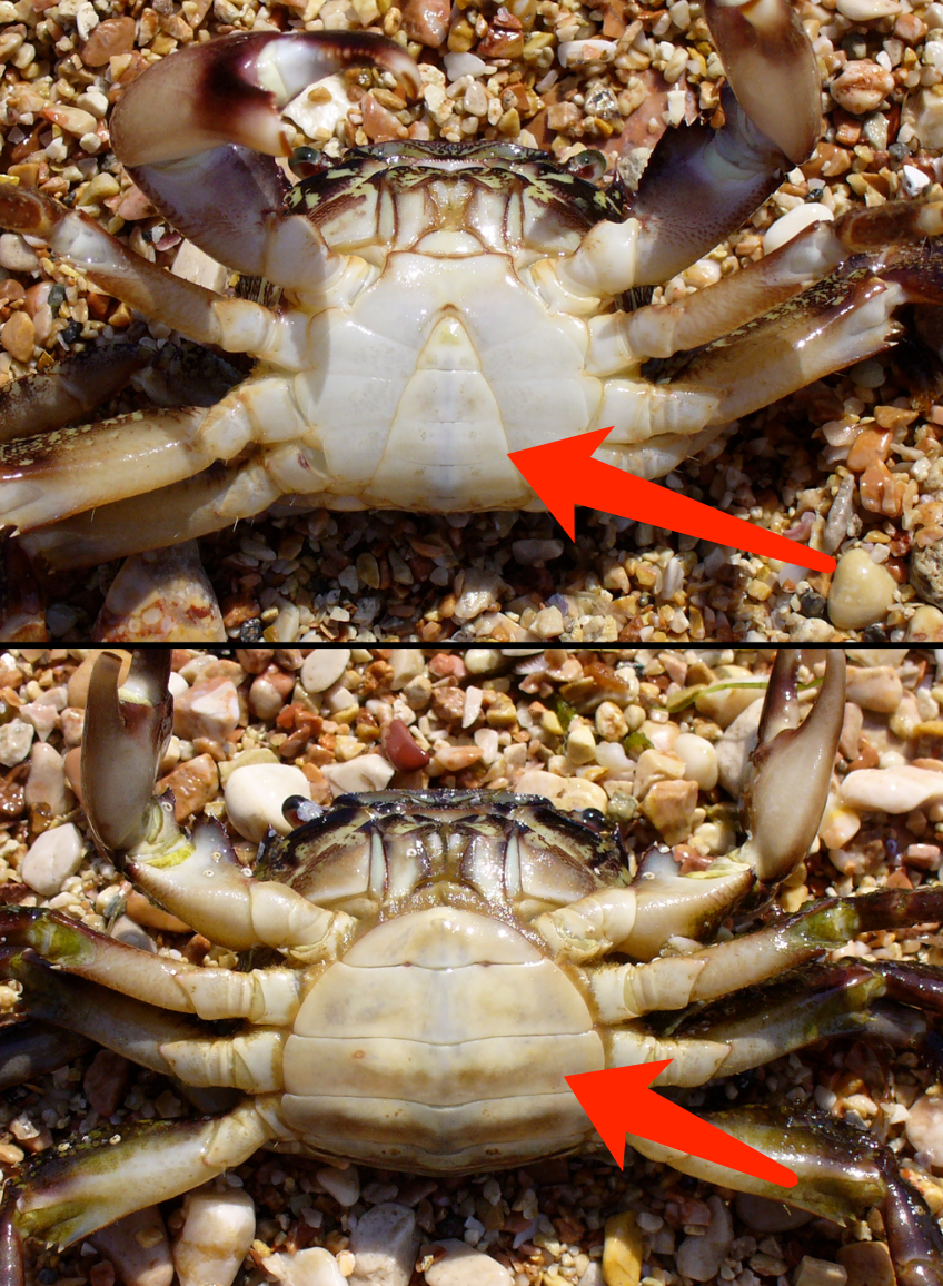 公螃蟹(上)和母螃蟹(下)不同的腹部形状,图片来源:Wikipedia