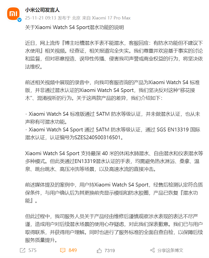 有些博主为了博眼球,把小米客服针对 Xiaomi Watch S4 标准版( 未做潜水认证 )给出的 “ 支持防水,但不建议下水 ” 这个回复,嫁接到了通过潜水认证的 Sport 版本头上,刻意带偏节奏。