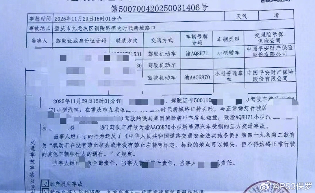 从网上流出的责任事故认定书可知,交警部门认定白色轿车驾驶员负全部责任,装甲车驾驶员和蔚来车主无责。