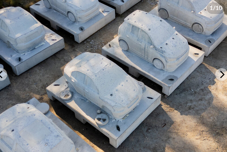 这22辆“汽车”,每一辆重达13吨,是通过数字建模、3D打印模具、最终浇筑而成,汽车下面的底托是用来固定的。