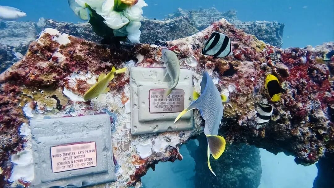 当人死后火化成骨灰,骨灰可以和混凝土融合形成人工礁,上面刻着名字,然后放在14米深的海底。