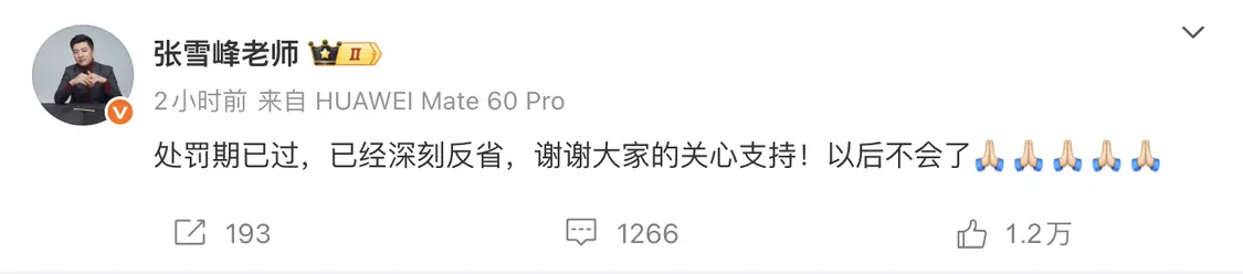 随后,张雪峰在其微博发文称:“处罚期已过,已经深刻反省,谢谢大家的关心支持,以后不会了。”