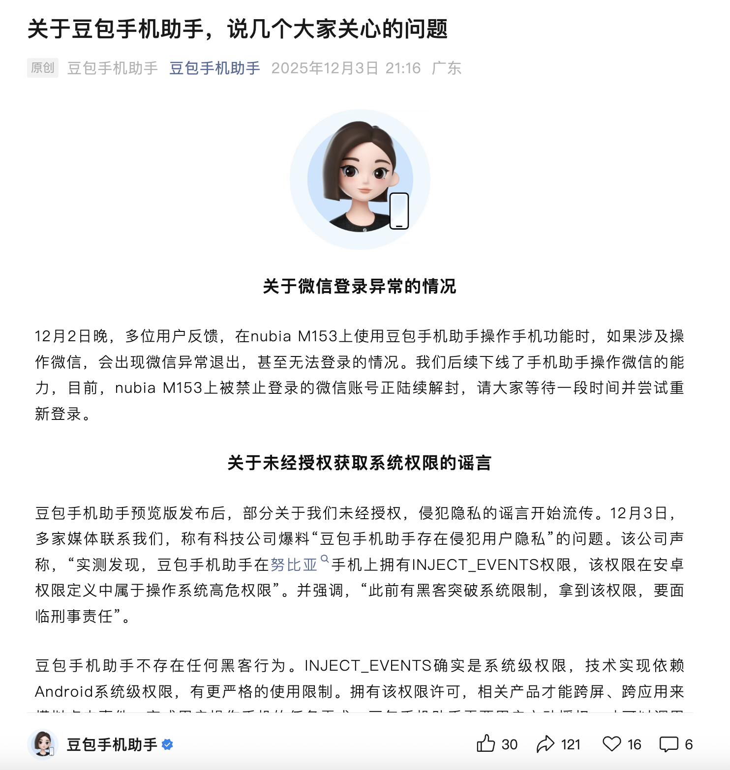豆包手机助手回应争议:不会代替用户进行相关授权和敏感操作