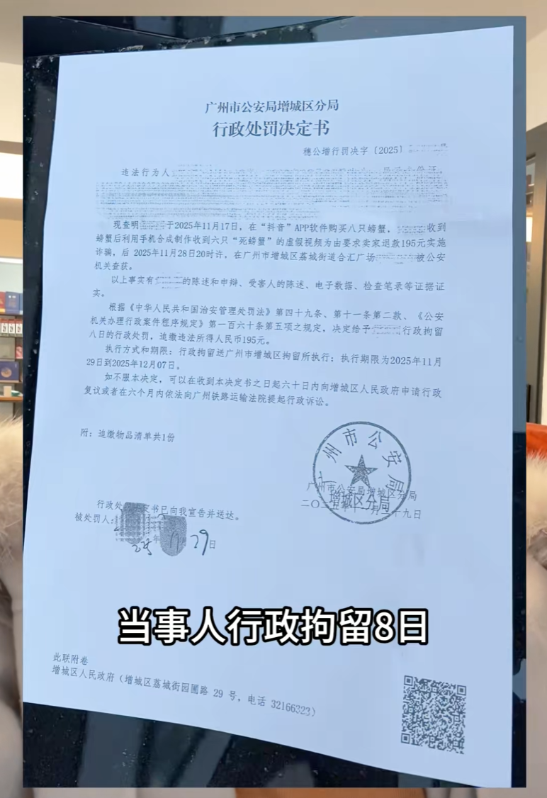 顾客AI合成死螃蟹要求退款被拘8日 195元全额追回