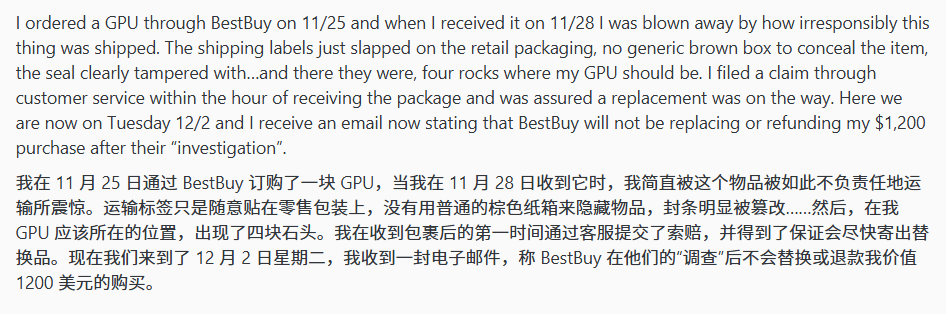当他打开包装后,发现原本应该放置显卡的位置,赫然躺着四块“坚硬的石头”,GnaDead随即联系了BestBuy的客服,当时客服还承诺会尽快安排补发显卡。