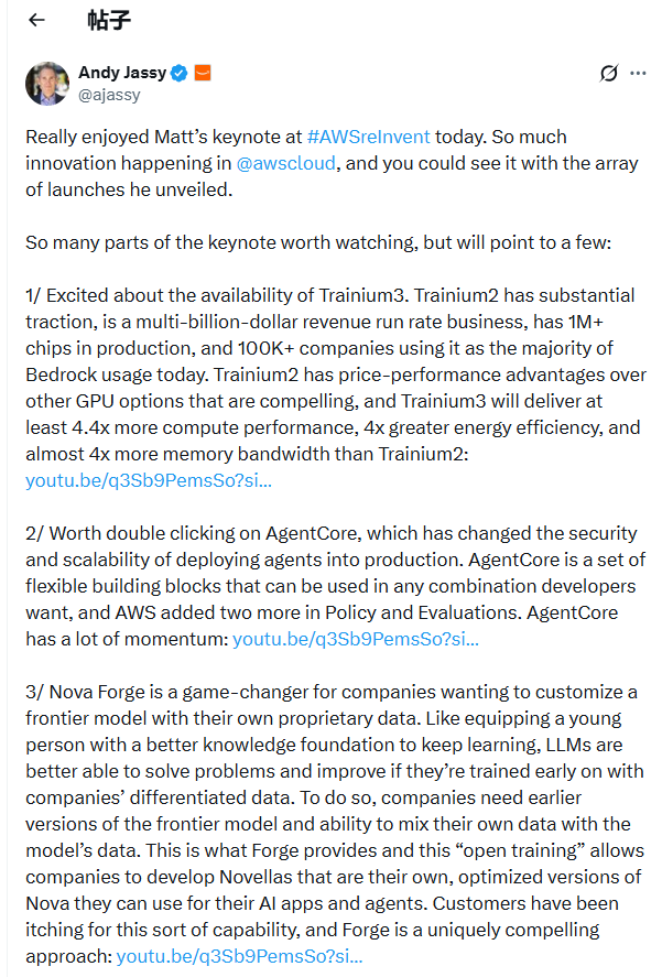 这一表态首次量化了亚马逊自研芯片的商业成功,直接回应了市场对其在AI基础设施领域竞争力的关切。Jassy强调,客户选择Trainium的核心原因是其“相较于其他GPU选项极具吸引力的性价比优势”,这正是亚马逊经典的商业模式——以更低价格提供自研技术。