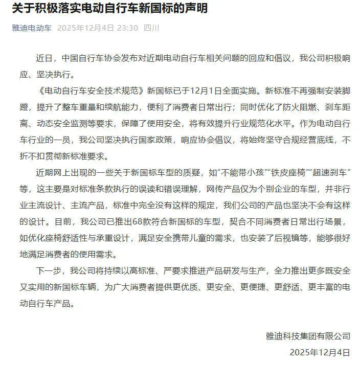 12月5日,针对近期网络热议的新国标电动自行车出现“铁皮座椅”“无法带人”等争议,雅迪科技集团于昨日深夜发布声明回应。雅迪方面表示,网传的“奇葩”配置主要系对标准条款执行的误读,仅出现在个别企业车型中,并非行业主流设计,公司目前已推出的68款新国标车型均满足座椅舒适性与安全携带儿童等实际需求。