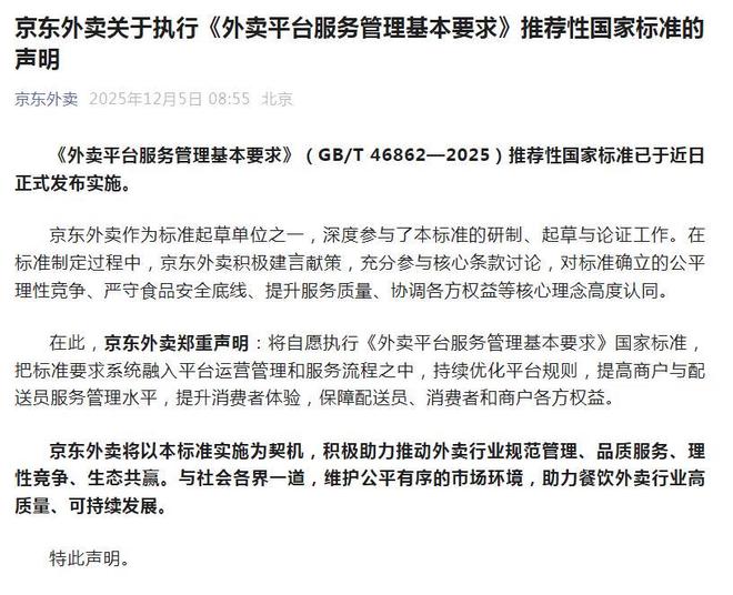 日前,淘宝闪购、美团、京东外卖相继发布执行《外卖平台服务管理基本要求》推荐性国家标准的声明。《外卖平台服务管理基本要求》(GB/T 46862—2025)推荐性国家标准已于近日正式发布实施。