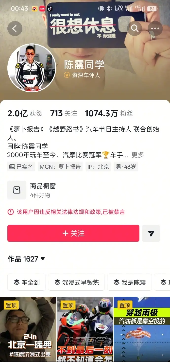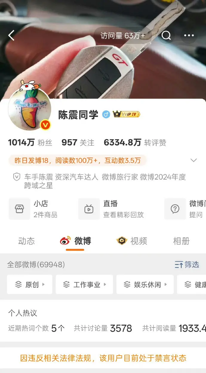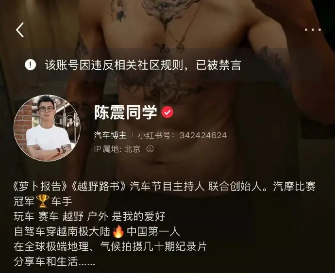 12月5日,“陈震多平台被禁言”相关话题词登上微博热搜榜第一。12月4日深夜,知名车评人陈震多个社交媒体平台账号被禁言。抖音平台显示,“该用户因违反相关法律法规和政策,已被禁言。”小红书平台显示,“该账号因违反相关社区规则,已被禁言。”