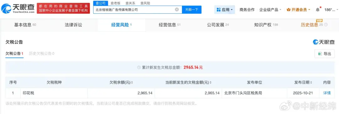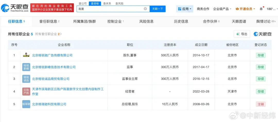 天眼查App显示,陈震名下共关联5家企业,其中4家为存续状态,包括北京格锐驰广告传媒有限公司、北京格锐新峰信息技术有限公司等,陈震在上述企业中担任监事等职务,版图涉及广告传媒、商贸等领域。此外,陈震名下北京格锐驰广告传媒有限公司现存1则欠税公告,欠税余额2965.14元,欠税税种为印花税。