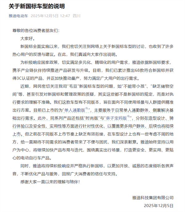 值得一提的是,就在今日,雅迪官方就旗下“毛豆”车型对新国标理解不准确对消费者致歉,雅迪称,其实这些都不是新国标的规定,而是对执行要求的理解不准确。