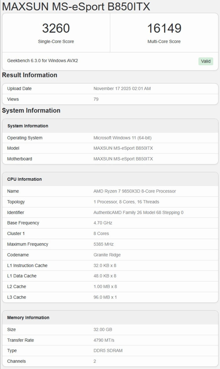 AMD的锐龙9800X3D处理器推出之后毫无悬念地成为最佳游戏CPU,如今它的继任者锐龙7 9850X3D也来了,性能跑分也已曝光。网友@Olrak29_曝光了GeekBench数据库中的锐龙7 9850X3D跑分,搭配的主板有七彩虹和铭瑄的,但是两个测试中的频率不一样,前者是5.6GHz,后者识别的只有5.38GHz,比传闻的频率低了200MHz。
