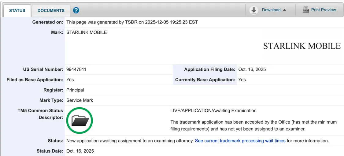 根据美国专利商标局网站的信息,SpaceX已在今年10月16日提交了这一商标申请,目前正等待分配审查员。该商标涉及通信服务也就是个人蜂窝服务,以及文本、语音和音频的双向传输。