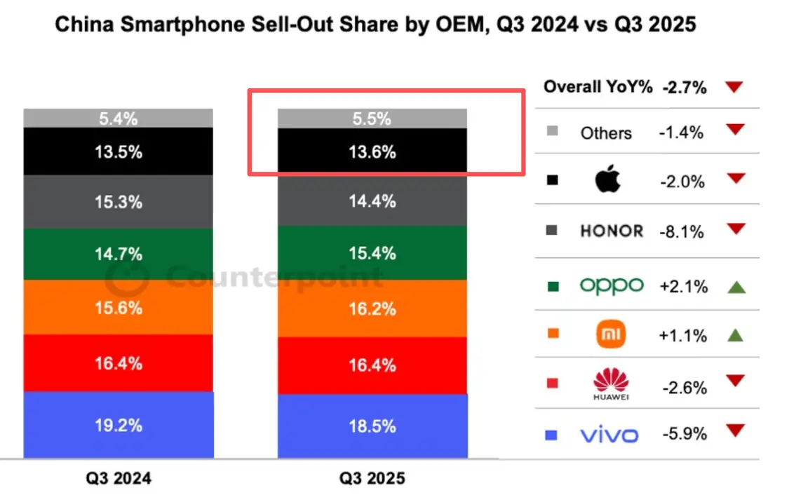 Counterpoint估计,在iPhone 17于今年9月中旬发布后的一个月里,苹果在中国的手机销量同比增长了22%,这表明消费者对其缺乏AI功能的担忧程度,比中国竞争对手预期的要低。