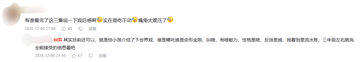 有网友看后评价称:“目前看还可以吧,动作流畅,画面也挺舒服的。”“看到第二集没想到剧情还挺有意思的。”“哪吒的建模是2003版哪吒传奇里的建模,画风很还原。”