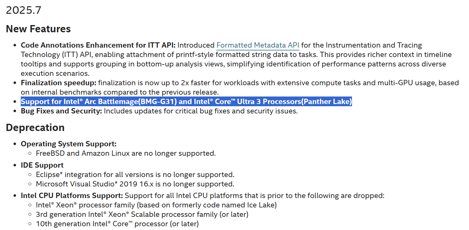 一直以来在传闻中“神龙见首不见尾”的Intel Battlemage架构高端显卡BMG-G31,近日终于获得了官方的首次公开确认。该GPU的名称出现在Intel的性能分析工具VTune Profiler更新日志中,更新日志明确指出,新版本增加了对两款核心硬件的支持: