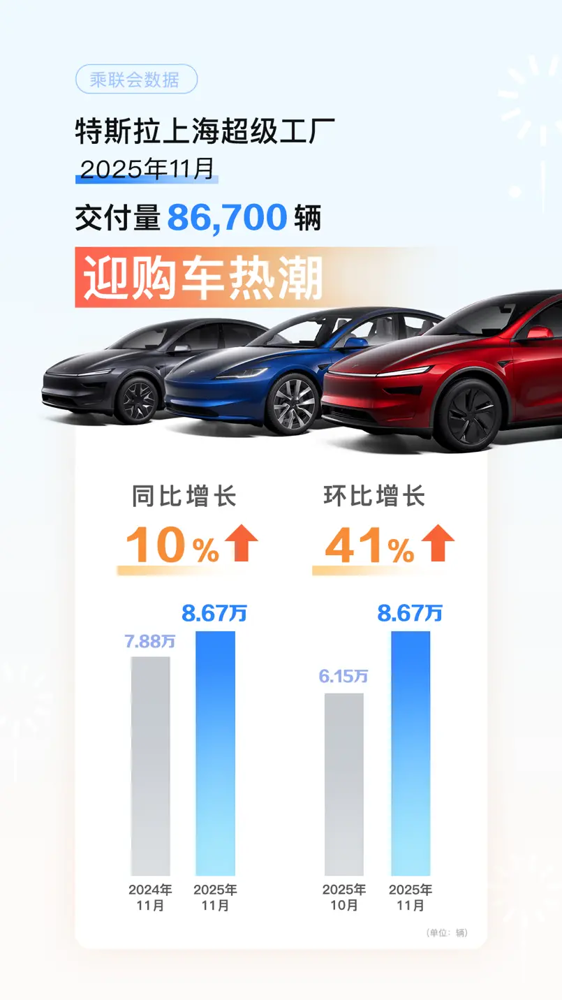 根据中国乘用车联合会12月2日发布的数据,11月该工厂共交付Model 3和Model Y车型86700辆,同比增长10%,环比增长40%。该工厂除供应中国市场外,也面向欧洲及亚太地区出口,2025年10月单月出口量超过3.5万辆。