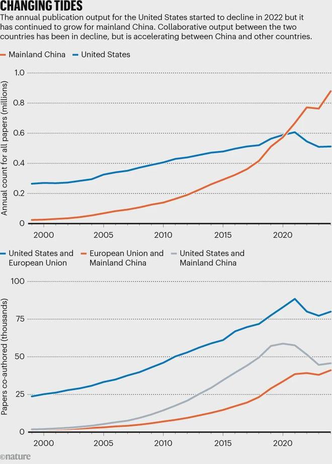 反观美国,其国内研究的引用影响力数十年来持续下滑,且自2018年起下降加速。更关键的是,美国与中国的科研合作——这本是其整体影响力的重要支柱——也在2019年左右开始停滞并下降。