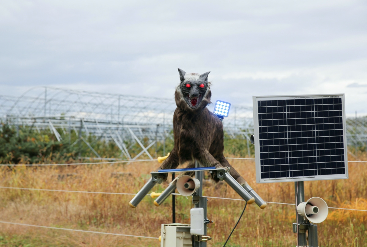 “怪狼”外观为凶狠的狼形模型,其内部装有红外传感器,当探测到动物接近时,它会转动头部、亮起红色眼睛、闪烁蓝色LED灯,并发出响亮的声音进行威慑。