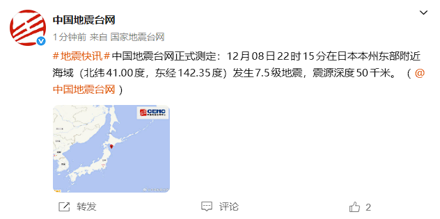继续更新:中国地震台网正式测定:12月08日22时15分在日本本州东部附近海域(北纬41.00度,东经142.35度)发生7.5级地震,震源深度50千米。