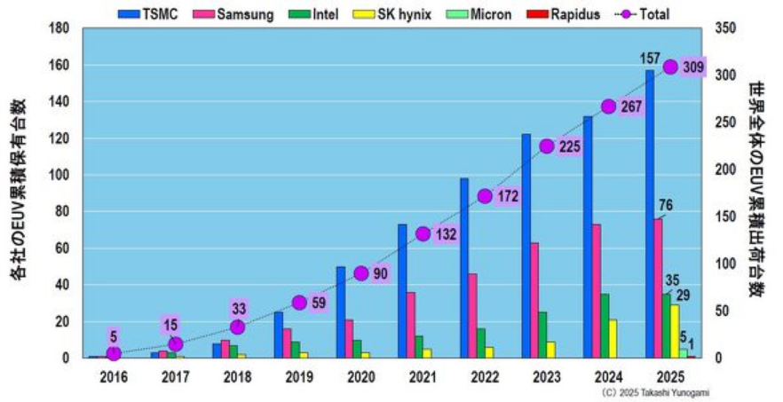 三星工厂里有76台EUV光刻机,Intel有35台,SK海力士有29台,美光有5台,22年才成立的日本Rapidus公司有1台EUV光刻机。