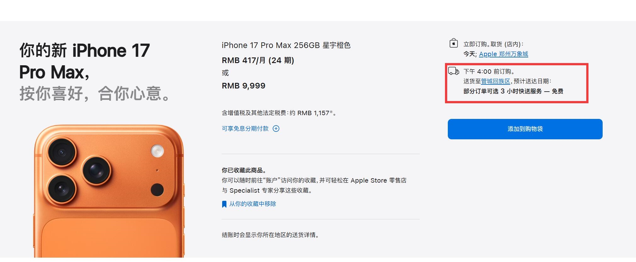 截至目前,苹果官网的iPhone 17 Pro和iPhone 17 Pro Max均为现货销售,但是iPhone 17 256GB标准版在苹果零售店没有现货,预计送达时间是12月14日-12月17日。