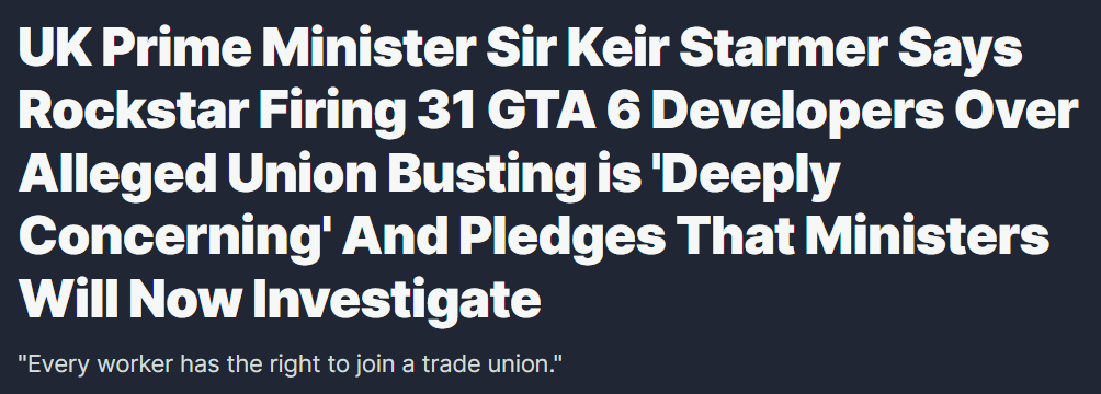开发商Rockstar Games近期因解雇31名《GTA6》员工而引发争议。据IGN报道,此事已引起英国首相基尔·斯塔默(Sir Keir Starmer)的关注,他表示这是“令人深切担忧”的事件,并承诺政府部长将对此展开调查。