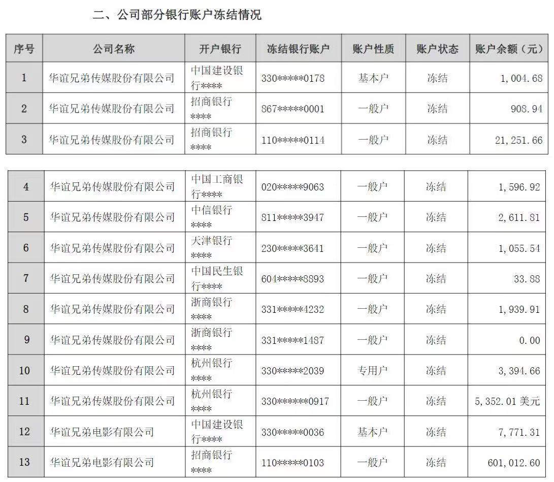 华谊兄弟昨日公告称,截至2025年12月10日,公司逾期债务合计为5250万元,超过公司2024年经审计净资产的10%。银行账户冻结情况部分,华谊兄弟已被冻结的银行账户有13个,账户余额最多的有60余万元,最少的为0元。