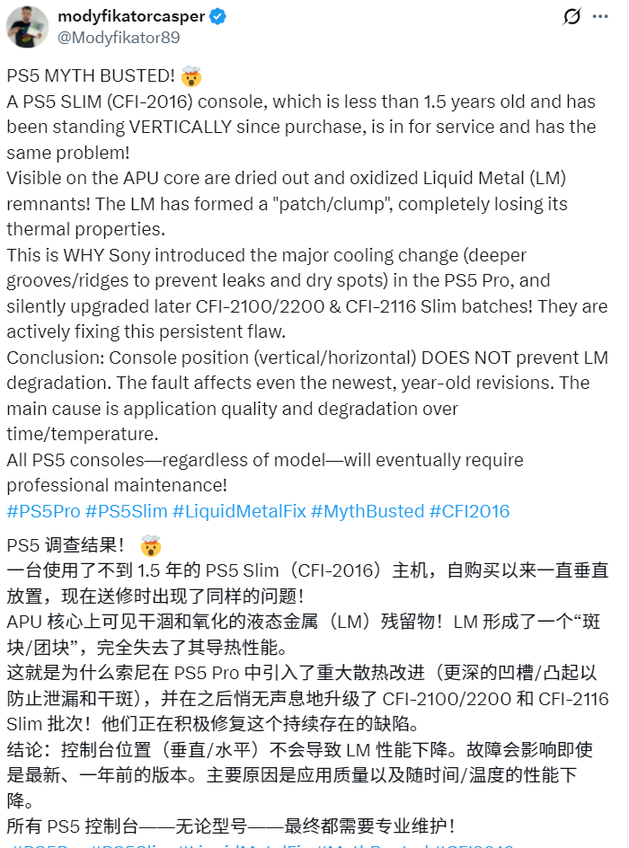 其认为,这表明主机的摆放方式并非问题的关键因素,真正的症结在于液态金属的涂抹质量,以及随着时间推移和温度变化累积所造成的自然老化,他甚至断言:“所有PS5主机最终都需要维修。”