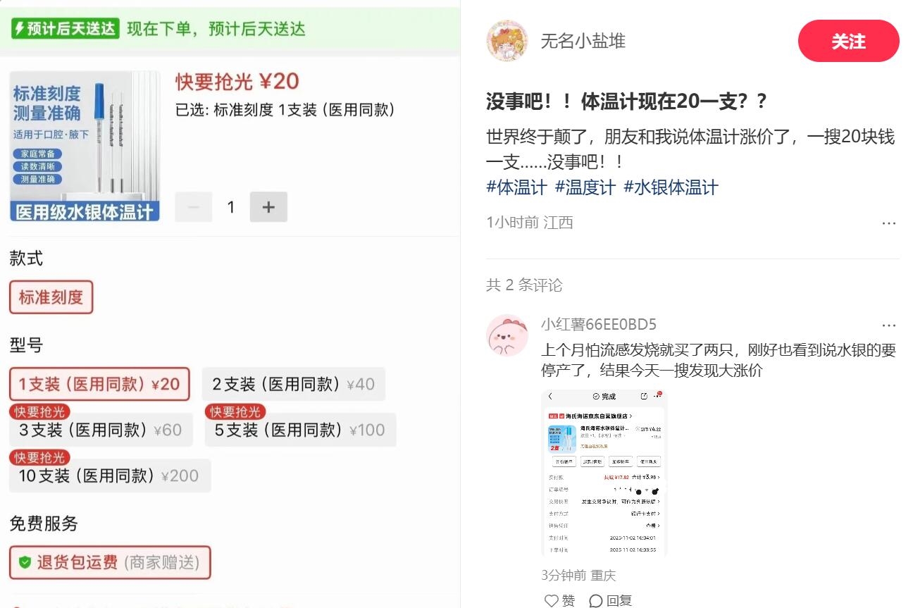 成都一家连锁药店的工作人员表示,最近流感多,之前的都卖完了,暂时还没进到货。另一家连锁药店感叹,虽然刚刚补充了库存,但最近卖得比较多,已经售罄了。因水银体温计在短时间内需求量激增,其价格也从几块钱一支上涨到20元一支。
