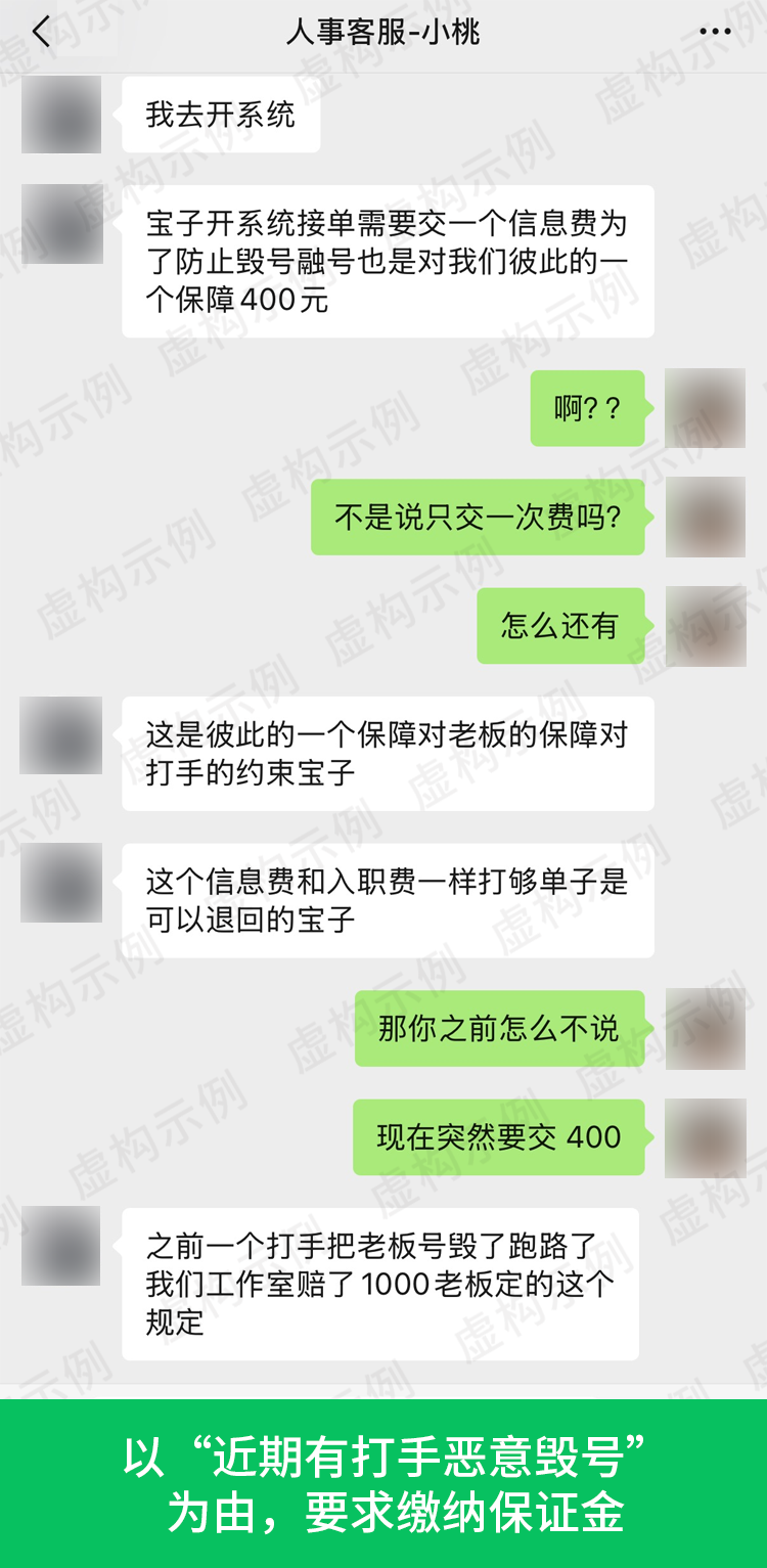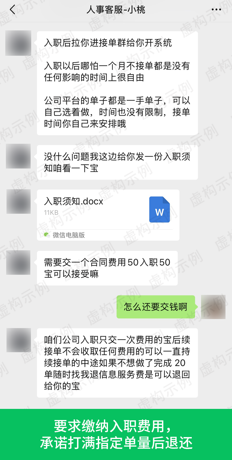 添加好友后,诈骗分子会发送看似正规的“入职须知”,营造靠谱假象,接着要求缴纳50元左右的“入职费”和“合同费”,并承诺 “打满指定单量就退还”,让受害人放松警惕,自愿掏钱。