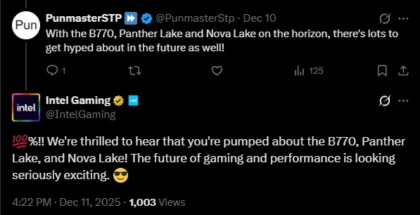 好消息是,B770显卡应该还是存在的,而且Intel Gameing官方号日前还在网上激动误发,称用户对其B770显卡感到兴奋。