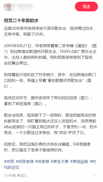近日,一位何炅的粉丝在社交平台晒出其特殊收藏——一瓶何炅在二十年前饮用过的水,迅速引发关注与热议。这位粉丝在社媒发文称:这是20年前何老师来哈尔滨开歌友会,现场喝过的水,还有半瓶,我留了20年。2005年8月21日,何老师带着第二张专辑《漫游》到拉斯维加斯酒吧开歌友会,我和我哥很早就到了现场,坐在舞台旁边。