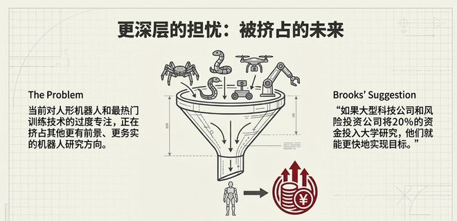 布鲁克斯的担忧也指向了另一个深层次的问题:当前对人形机器人和最热门训练技术的过度专注,正在挤占其他更有前景、更务实的机器人研究方向。他指出:“如果大型科技公司和风险投资公司将20%的资金投入大学研究,他们就能更快地实现目标。”