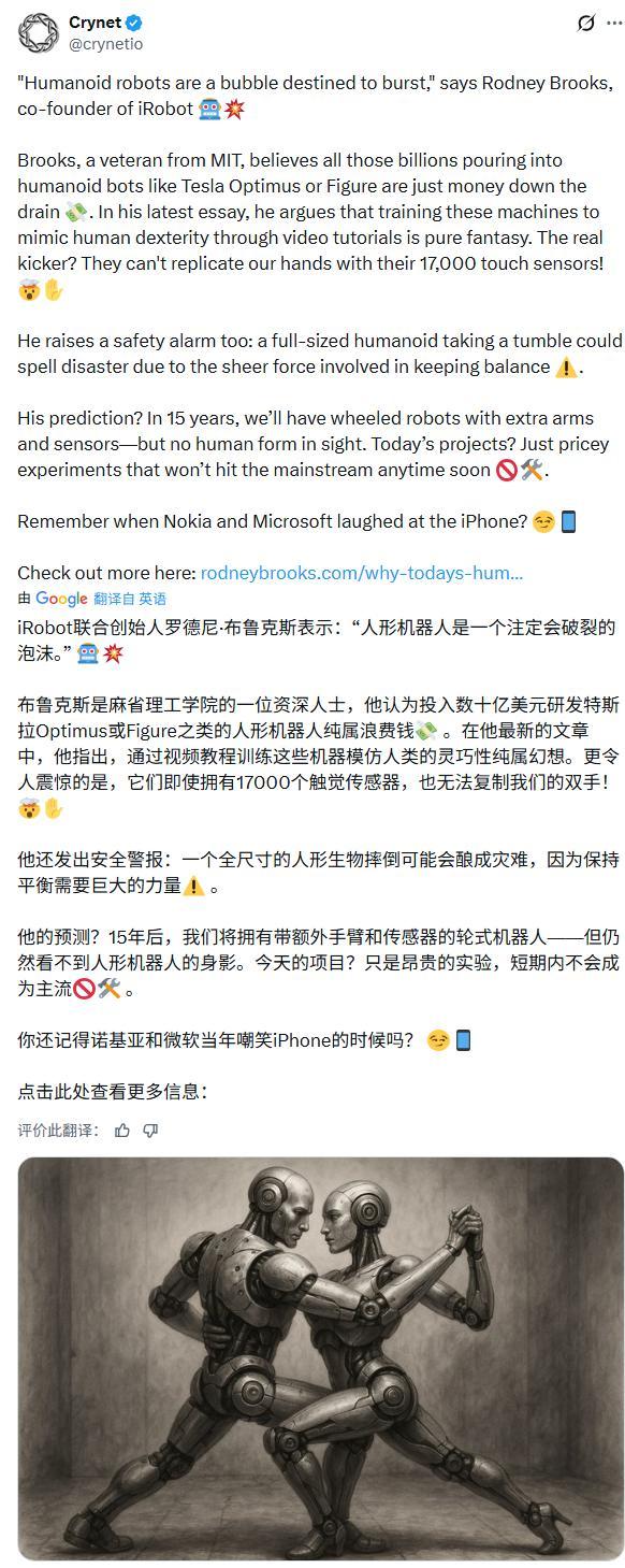 布鲁克斯的批判并非空穴来风,他直指人形机器人结构固有的三大缺陷,让它们从科幻梦想迅速降维到“昂贵且危险的玩具”。