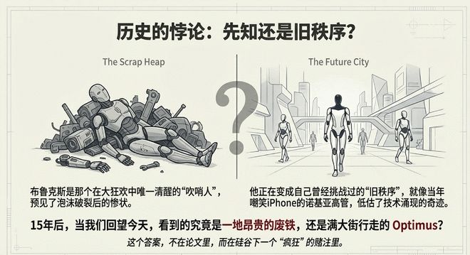历史总是充满悖论:布鲁克斯可能是那个在大狂欢中唯一清醒的“吹哨人”,预见了泡沫破裂后的惨状;但也可能,他正在变成自己曾经挑战过的“旧秩序”,就像当年嘲笑iPhone的诺基亚高管一样,低估了技术涌现的奇迹。