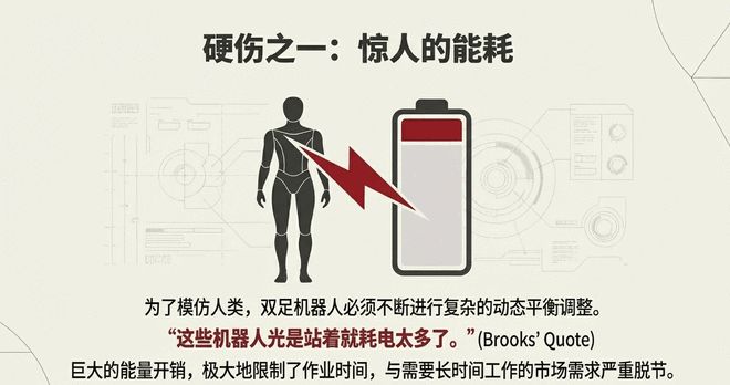 1. 惊人的能耗问题: 这些双足机器人在设计上为了模仿人类,必须不断地进行复杂的动态平衡调整。布鲁克指出:“这些机器人光是站着就耗电太多了。”一个用于维持站立姿态的巨大能量开销,极大地限制了它们的作业时间,与需要长时间工作的市场需求严重脱节。