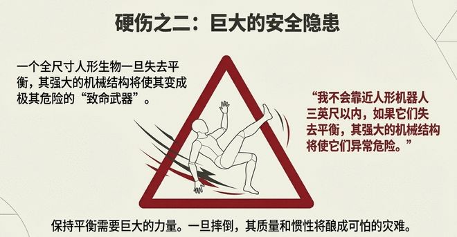 2. 巨大的安全隐患: 布鲁克斯警告称:“我不会靠近人形机器人三英尺(约0.9米)以内,如果它们失去平衡,其强大的机械结构将使它们异常危险。” 保持平衡需要巨大的力量,而一旦这个全尺寸的人形生物摔倒,其质量和惯性将酿成一场可怕的灾难。