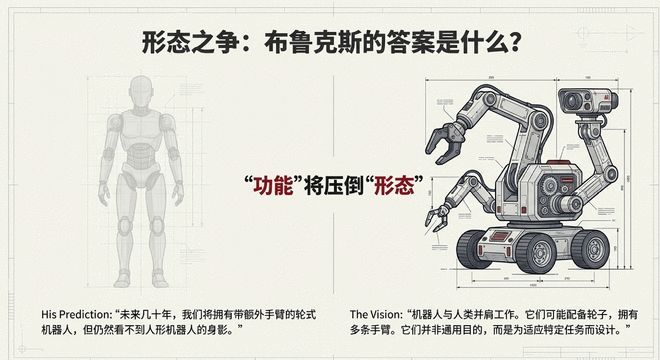 他相信未来几十年,机器人将与人类并肩工作,它们可能配备轮子、拥有多条手臂,且并非通用目的。换言之,“功能”将压倒“形态”。最有效的机器人形态,是为了适应特定任务而设计的,而不是为了模仿人类的外观。