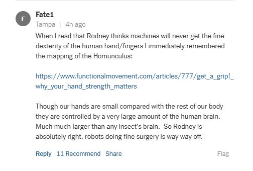 网友也认同布鲁克斯的观点,认为:“人类给一双小手配了‘超大脑区’,机器人想学会精细手术,难度不小。”